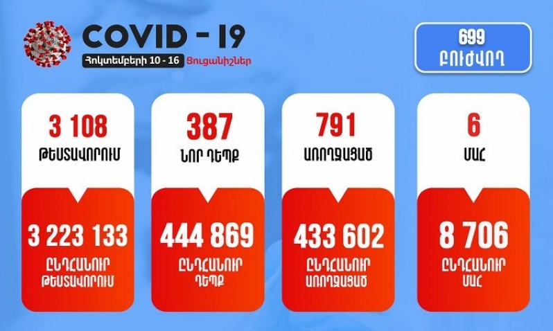 Հոկտեմբերի 10-16-ը Հայաստանում գրանցվել է կորոնավիրուսային հիվանդության 387 նոր դեպք, կատարվել է 3108 թեստավորում: Առողջացել է 791 բուժառու, արձանագրվել է մահվան 6 դեպք:Այսպիսով, հաստատվել է ...