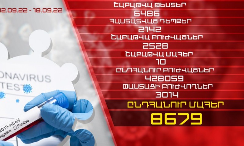 Սեպտեմբերի 12-18-ը Հայաստանում իրականացվել է 6486 թեստավորում, հաստատվել է կորոնավիրուսի 2142 նոր դեպք, առողջացել է 2528 քաղաքացի: Արձանագրվել է մահվան 10 դեպք:Այսպիսով, հաստատվել է կորոնավիրուսային ...