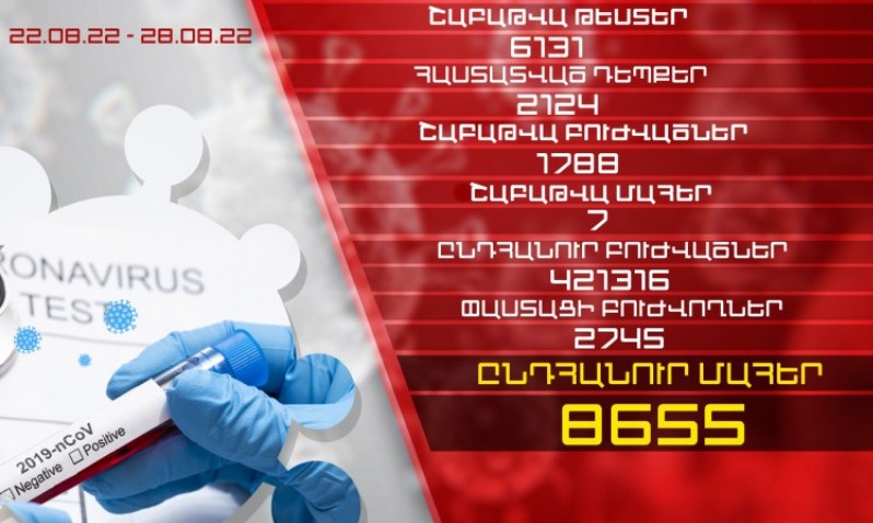 Օգոստոսի 22-28-ը Հայաստանում գրանցվել է կորոնավիրուսային հիվանդության 2124 նոր դեպք, կատարվել է 6131 թեստավորում: Առողջացել է 1788 բուժառու, արձանագրվել է մահվան 7 դեպք:Այսպիսով, հաստատվել է ...