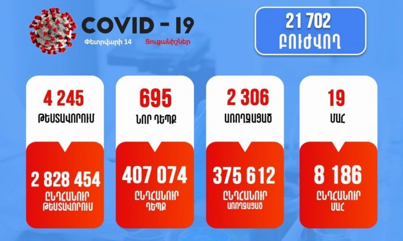 Հայաստանում փետրվարի 14-ին կատարվել է 4245 թեստավորում, որից հաստատվել է կորոնավիրուսային հիվանդության 695 նոր դեպք:Առողջապահության նախարարության հաղորդմամբ` մեկ օրում առողջացել է 2306 հիվանդ, մահվան 19 ...