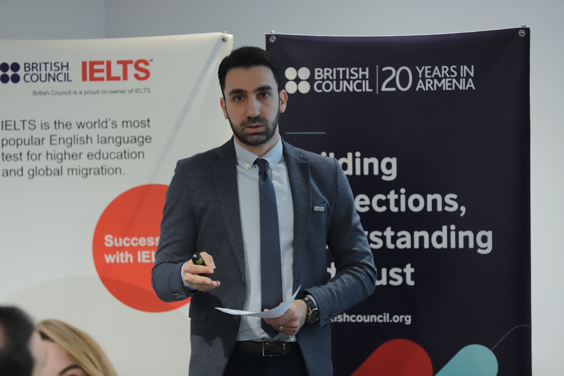 Բրիտանական խորհրդի հայաստանյան մասնաճյուղի անգլերեն ծրագրերի ղեկավար Ադդէ Հովասափյանը ներկայացրել է «Անգլերենը՝ որպես դասավանդման լեզու» հետազոտության արդյունքները: Նրա խոսքով՝ տվյալները հավաքագրվել են ԿԳՄՍ նախարարության, բուհերի և հետբուհական հաստատությունների ներկայացուցիչների հետ հանդիպումների, 3 բուհ այցերի, դասերի դիտարկումների և խմբային քննարկումների, ինչպես նաև 18 բուհում 383 մասնակցի (247 ուսանող և 127 դասախոս) շրջանում հարցումներ իրականացնելու միջոցով: Որպես հետազոտության արդյունք՝ մատնանշվել է դպրոցների շրջանավարտների անգլերենի ցածր մակարդակը, օտարերկրյա ուանողների փոքր թիվը, անգլերենի միջազգային թեստերի սահմանափակ կիրառումը, ուսանողների և դասախոսական կազմի անգլերենի բարելավման շարունակական կարիքը, ոչ ինտերակտիվ դասավանդման մոտեցումը, համապատասխան ռեսուրսների համալրումը և այլն: