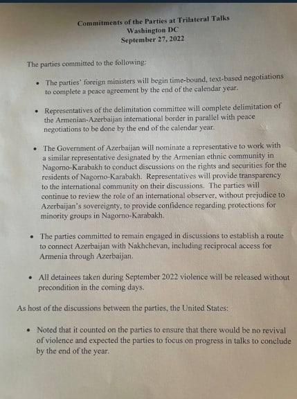 Ռուսական տելեգրամյան ալիքները արտահոսք են արել, իրենց պնդմամբ՝ այն փաստաթուղթը, որի շուրջ սեպտեմբերի 27-ին Վաշինգտոնում բանակցել և ստացել են ՀՀ ԱԽ քարտուղար Արմեն Գրիգորյանը Ալիևի օգնական Հիքմեթ Գաջիևի հետ։ Աղբյուրը պնդում է, որ հենց այս փաստաթուղթն է դարձել Պրահայում Փաշինյան-Ալիև-Էրդողան զրույցների հիմնական թեման։