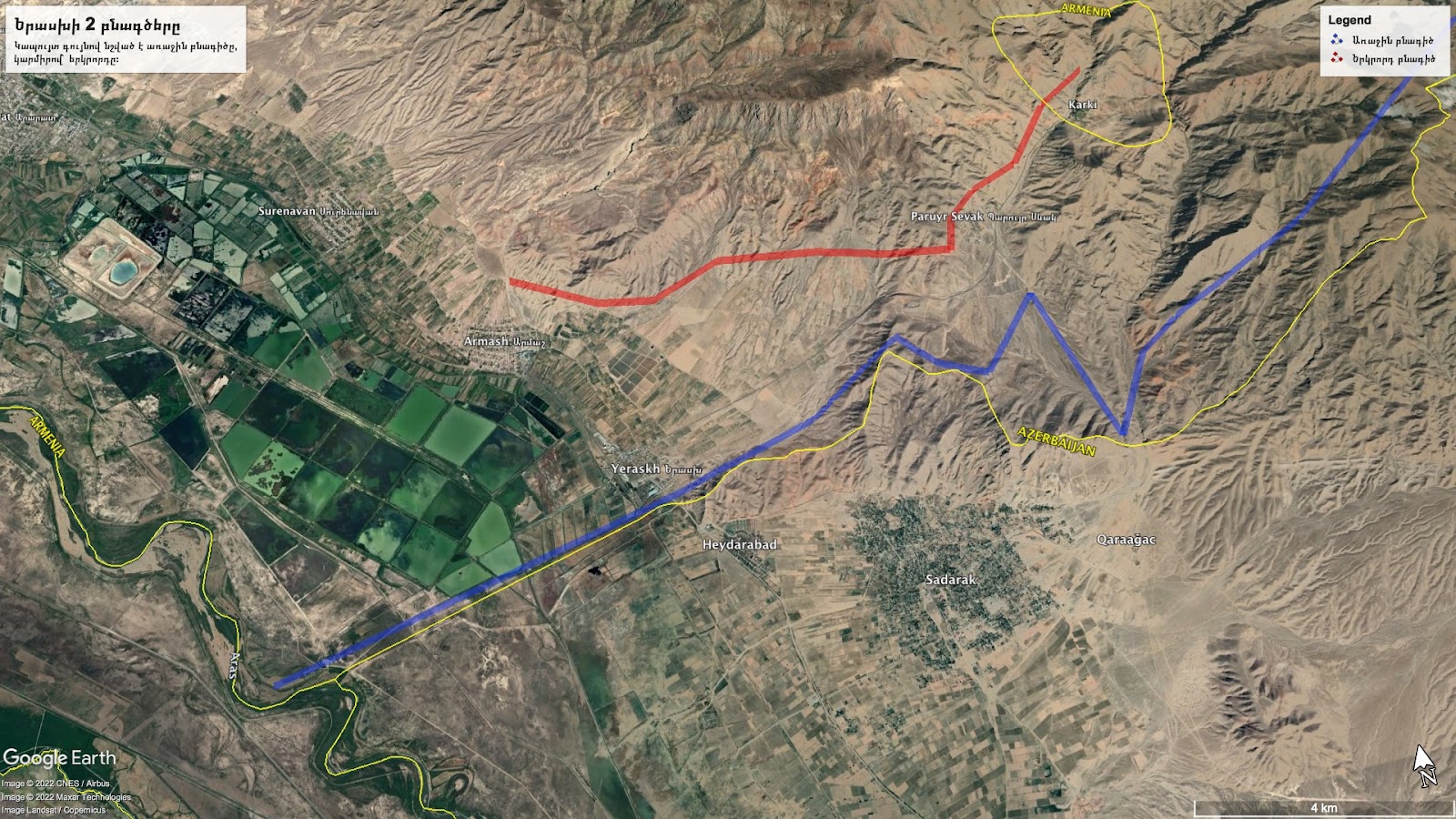 Լուսանկարում կապույտով նշված է Երասխի առաջին բնագիծը, կարմիրով՝ երկրորդը, առաջինը շարունակվում է, մինչդեռ երկրորդ բնագիծը սկսվում է Արմաշի գերեզմաններից ու ավարտվում Տիգրանաշենի ճանապարհի մոտ։ Հակառակորդը, ճեղքելով առաջին բնագիծը, հեշտությամբ հայտնվելու է հայկական զորքերի թիկունքում։