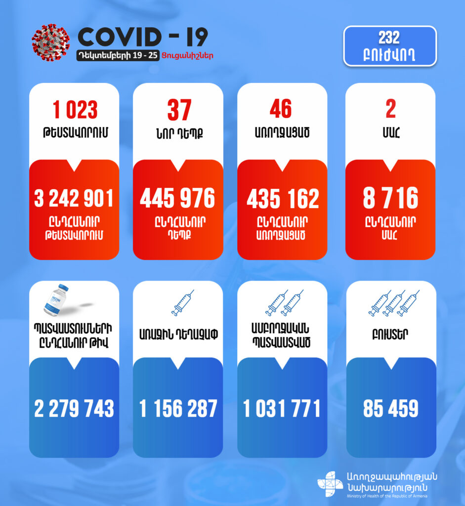 Փաստացի բուժում է ստանում 232 բուժառու: Ընդհանուր առմամբ, կորոնավիրուսի հետևանքով 8716 մահվան դեպք է արձանագրվել: Ընդհանուր կատարվել է 3 242 901 թեստավորում: