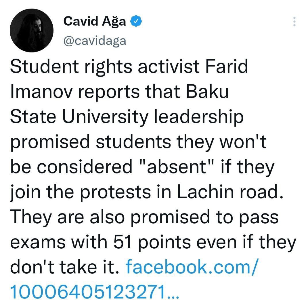 Ադրբեջանցի ուսանողական իրավապաշտպան Ֆարիդ Իմանովը հայտնել է, որ Բաքվի պետական համալսարանի ղեկավարությունը ուսանողներին խոստացել է, որ նրանք «բացակա» չեն ստանա, եթե միանան Լաչինի ճանապարհին տեղի ունեցող ցույցերին։ Նրանց նաև խոստանում են քննություններին նշանակել 51 բալ, եթե նույնիսկ դրանք չհանձնեն: Ավելին, ավելի բարձր գնահատական ցանկացողների համար կկազմակերպվի լրացուցիչ քննություն։