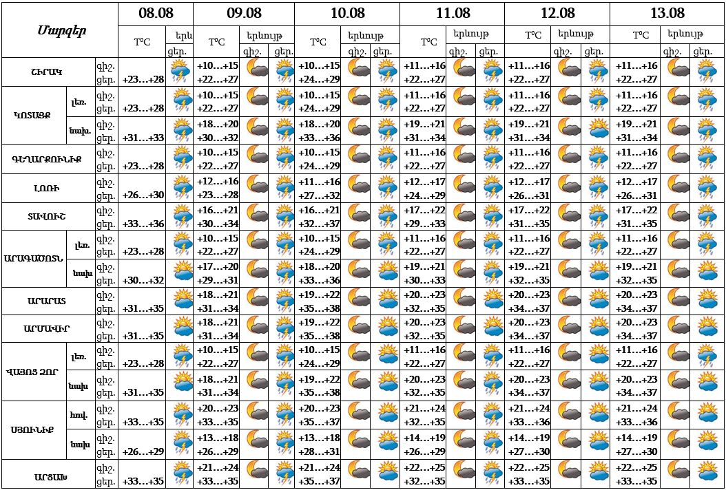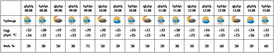 Երևան քաղաքում օգոստոսի 8-9-ը, 11-ին՝ կեսօրից հետո, 10-ին, 12-13-ի երեկոյան ժամերին քաղաքի առանձին հատվածներում սպասվում է կարճատև անձրև և ամպրոպ, ամպրոպի ժամանակ հնարավոր է քամու ուժգնացում՝ 18-20 մ/վ արագությամբ: