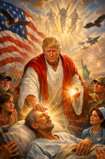Նկարում ամերիկացի առաջնորդը մի ձեռքովա դիպչում է հիվանդանոցի վերնաշապիկով պառկած տղամարդուն, իսկ նրա ափերից լույս է շողում։ Նկարում Թրամփին շրջապատում են ամերիկացի զինվորականը, բուժքույրը և աղոթող կինը, իսկ հետևի լուսանկարում պատկերված են ամերիկյան դրոշը, արծիվը, Ազատության արձանը, կործանիչները և հրավառությունը:
