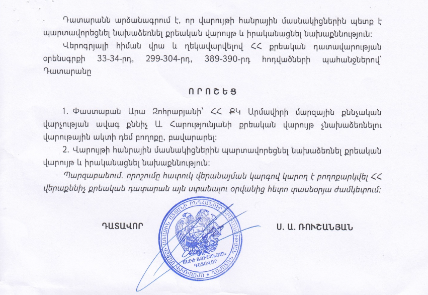 «Դատախազությունը մերժել էր քննչական մարմնի այդ ապօրինի դիրքորոշման դեմ ներկայացված բողոքը: Արմավիրի մարզի առաջին ատյանի ընդհանուր իրավասության դատարանը (դատավոր Սերժ Ռուշանյան) որոշել է բավարարել բողոքը՝ վարույթի հանրային մասնակիցներին ՊԱՐՏԱՎՈՐԵՑՆԵԼՈՎ ՆԱԽԱՁԵՌՆԵԼ ՔՐԵԱԿԱՆ ՎԱՐՈՒՅԹ և իրականացնել նախաքննություն: