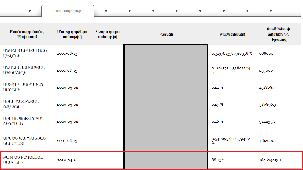 «Ճաննախագիծ ինստիտուտ» ՍՊԸ-ն ունի 20-ից ավելի բաժնետեր։ Սակայն բաժնեմասերի գերակշիռ մասը՝ 88,1 տոկոսը, 2020-ի ապրիլի 16-ից պատկանում է Բագրատ Սամվելի Բադալյանին։ Ըստ հայտարարագրի՝ Բադալյանը տասը տարի ժամկետով իր բաժմեասերը հավատարմագրային կառավարման է հանձնել կնոջը՝ Մարգարիտա Ագանիսյանին: