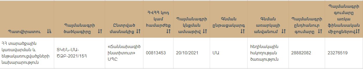 Նախարարությունը «Ճաննախագիծ ինստիտուտ» ՍՊԸ-ի հետ պայմանագիրը կնքել է առանց մրցույթի՝ մեկ անձից գնման ընթացակարգով։ Պայմանագրի ընդհանուր արժեքն է 28 882 082 դրամ կամ մոտ 60 000 դոլար։